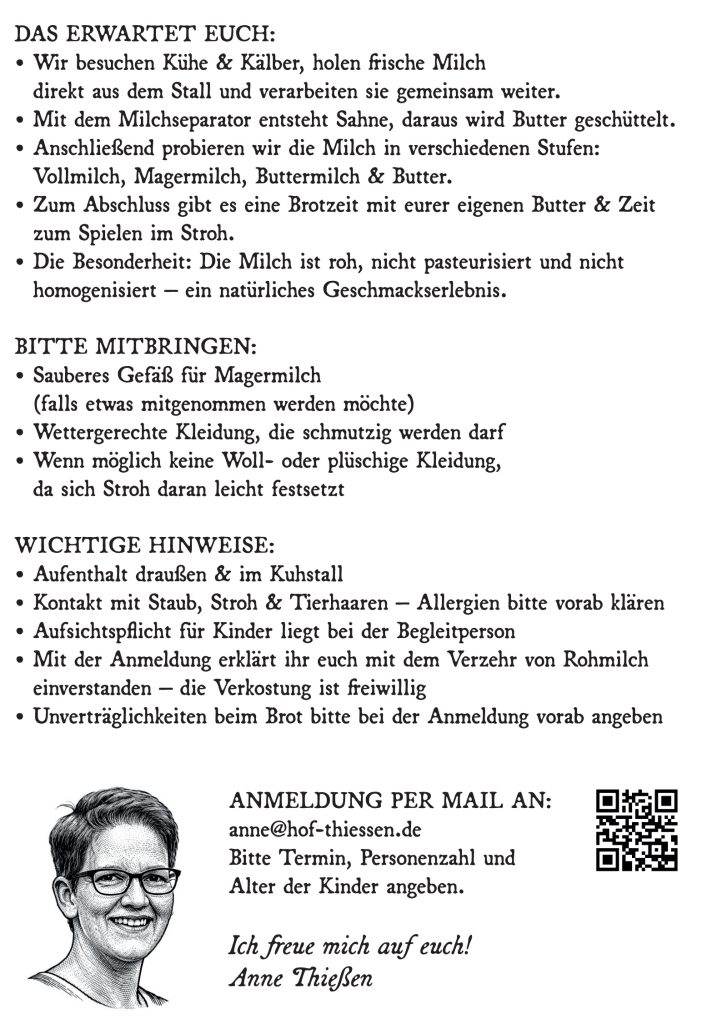Die Klüterkamer in der wir uns dafür aufhalten ist nahezu im Originalzustand von 1911 und daher nicht gedämmt. Bitte buchen Sie rechtzeitg ihren Wunschtermin, gerne per mail an anne@hof-thiessen.de